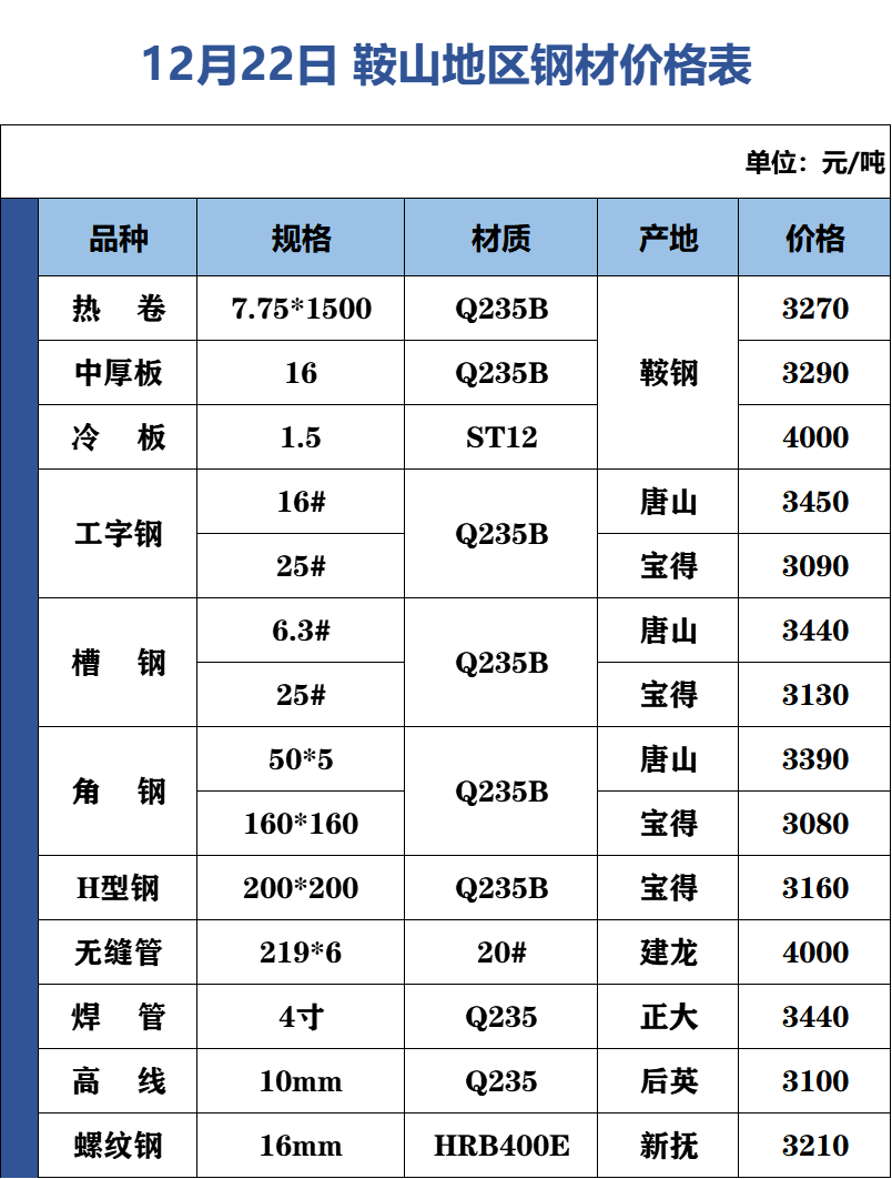 12月22日 鞍山地區(qū)鋼材價(jià)格表