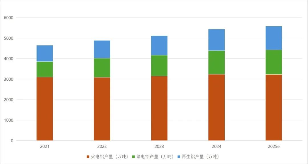 “十四五”期間,綠電鋁、再生鋁、火電鋁產(chǎn)量比重增長(zhǎng)趨勢(shì)圖