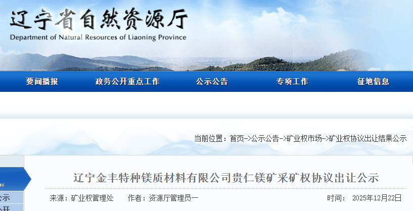 根據(jù)《自然資源部關(guān)于印發(fā)礦業(yè)權(quán)出讓交易規(guī)則的通知》(自然資規(guī)〔2023〕1號)有關(guān)規(guī)定,現(xiàn)將遼寧金豐特種鎂質(zhì)材料有限公司貴仁鎂礦采礦權(quán)協(xié)議出讓有關(guān)事項(xiàng)公示如下: