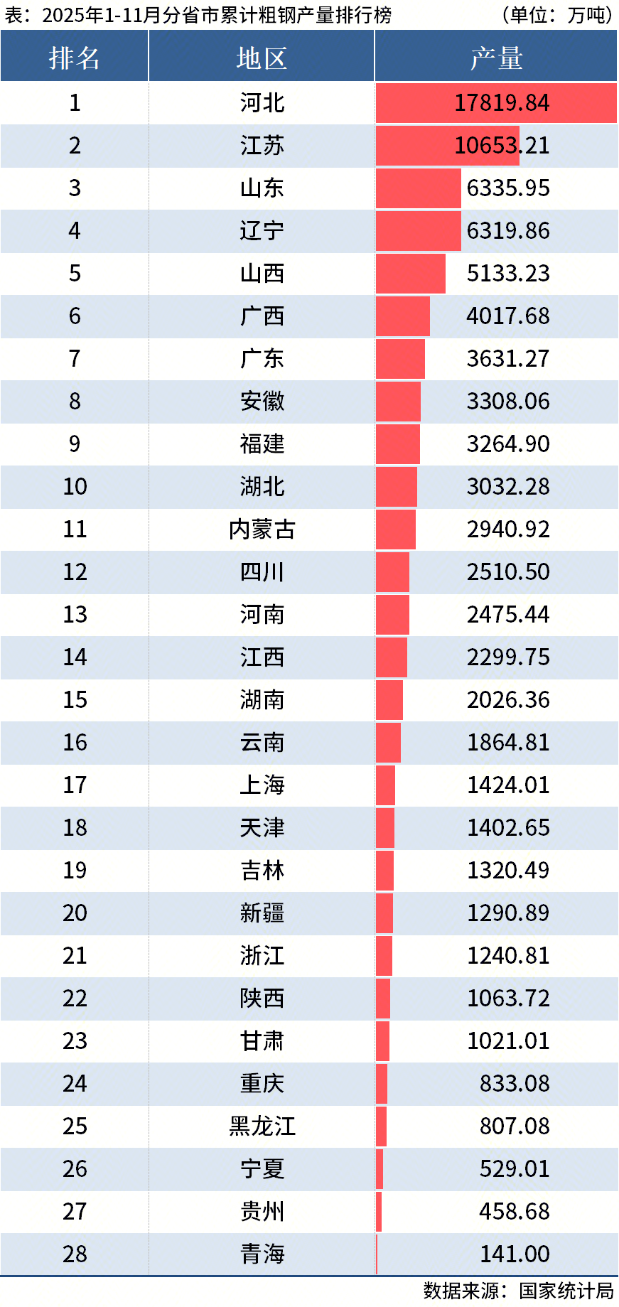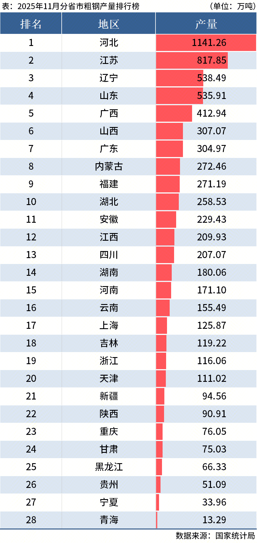 國家統(tǒng)計(jì)局?jǐn)?shù)據(jù)顯示,2025年11月中國粗鋼產(chǎn)量6987.1 萬噸,同比下降10.9%;1-11月累計(jì)粗鋼產(chǎn)量89166.5 萬噸,同比下降4.0%。